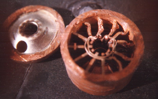 V magnetronu ze staré sovětské mikrovlnky už chybí katoda a některé rezonanční komůrky jsou od pilky poohýbané. Postranní díra ve víčku byla na odvádění VF energie a vedl tam měděý vodič přibodovaný na stěnu jedné komůrky. Vypadá to víc jako kovářská práce než jako přesná a naleštěná mikrovlnná technika, ale fungovalo to.