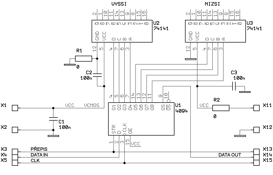 Příklad zapojení displeje retro hodin s digitrony - pouze řídící část, jedno dvojčíslo. Na plošný spoj je nutné dokreslit výstupy k digitronům podle konkrétního typu.